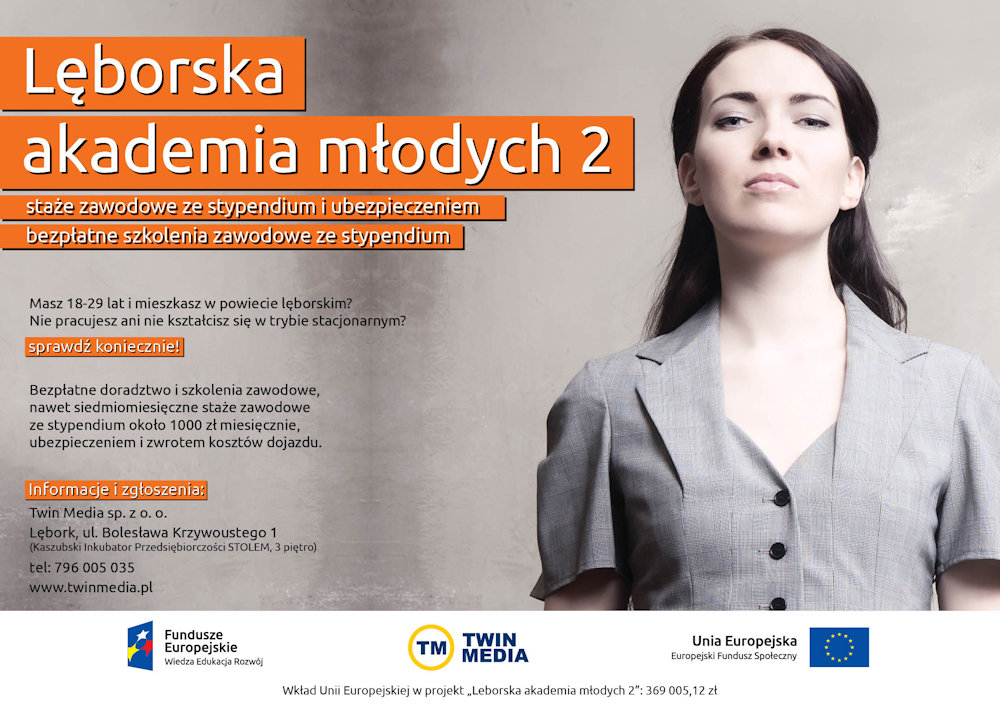 Twin Media Sp. z o.o. prowadząca Kaszubski Inkubator Przedsiębiorczości STOLEM w Lęborku zaprasza mieszkańców powiatu lęborskiego do skorzystania ze wsparcia oferowanego w ramach projektu „Lęborska akademia młodych 2”, który jest kontynuacją projektu „Lęborska Akademia Młodych”. W ramach projektu oferujemy doradztwo zawodowe, szkolenia zawodowe i staże przyuczające do zawodu.