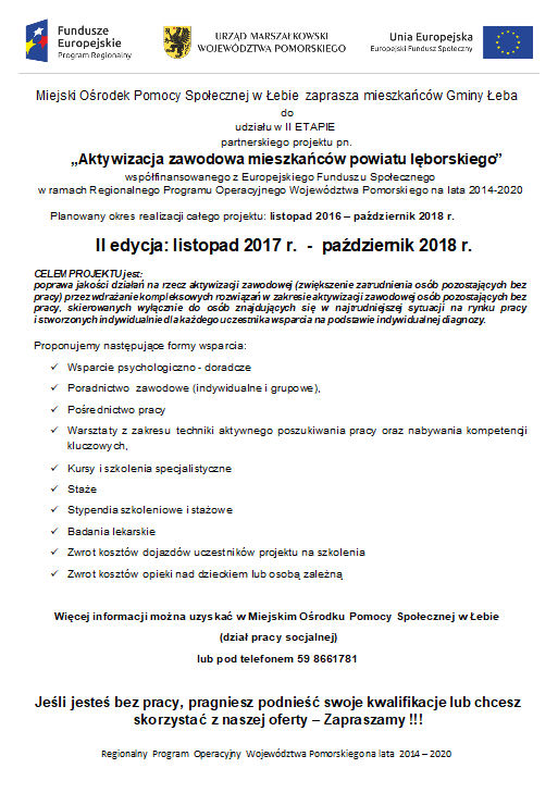 Miejski Ośrodek Pomocy Społecznej w Łebie zaprasza mieszkańców Gminy Łeba do udziału w II ETAPIE partnerskiego projektu pn. „Aktywizacja zawodowa mieszkańców powiatu lęborskiego” współfinansowanego z Europejskiego Funduszu Społecznego w ramach Regionalnego Programu Operacyjnego Województwa Pomorskiego na lata 2014-2020. Planowany okres realizacji całego projektu: listopad 2016 – październik 2018 r.