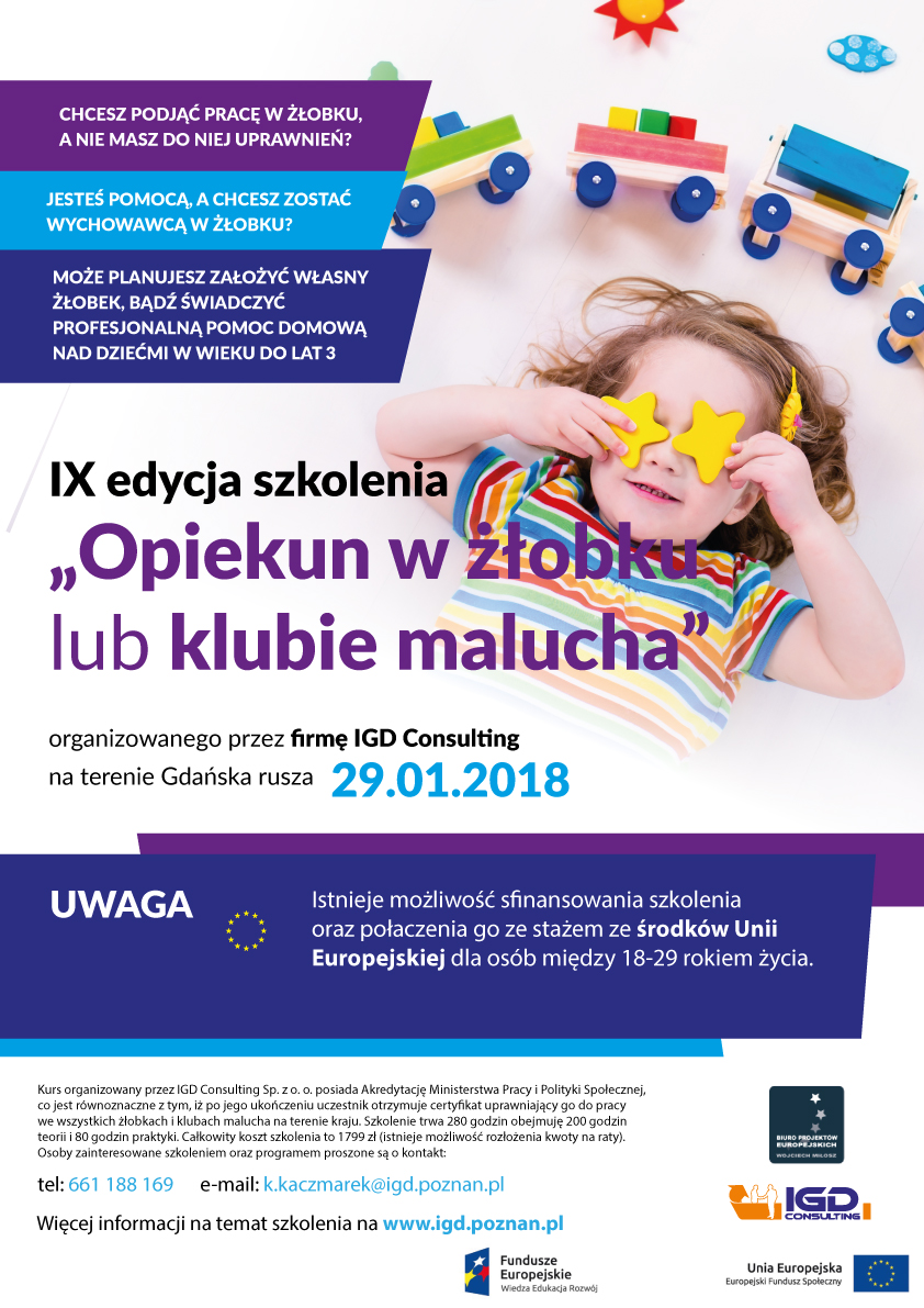 Zapraszamy do udziału w programie stażu połączonego ze szkoleniem „Opiekun w żłobku lub klubie dziecięcym”