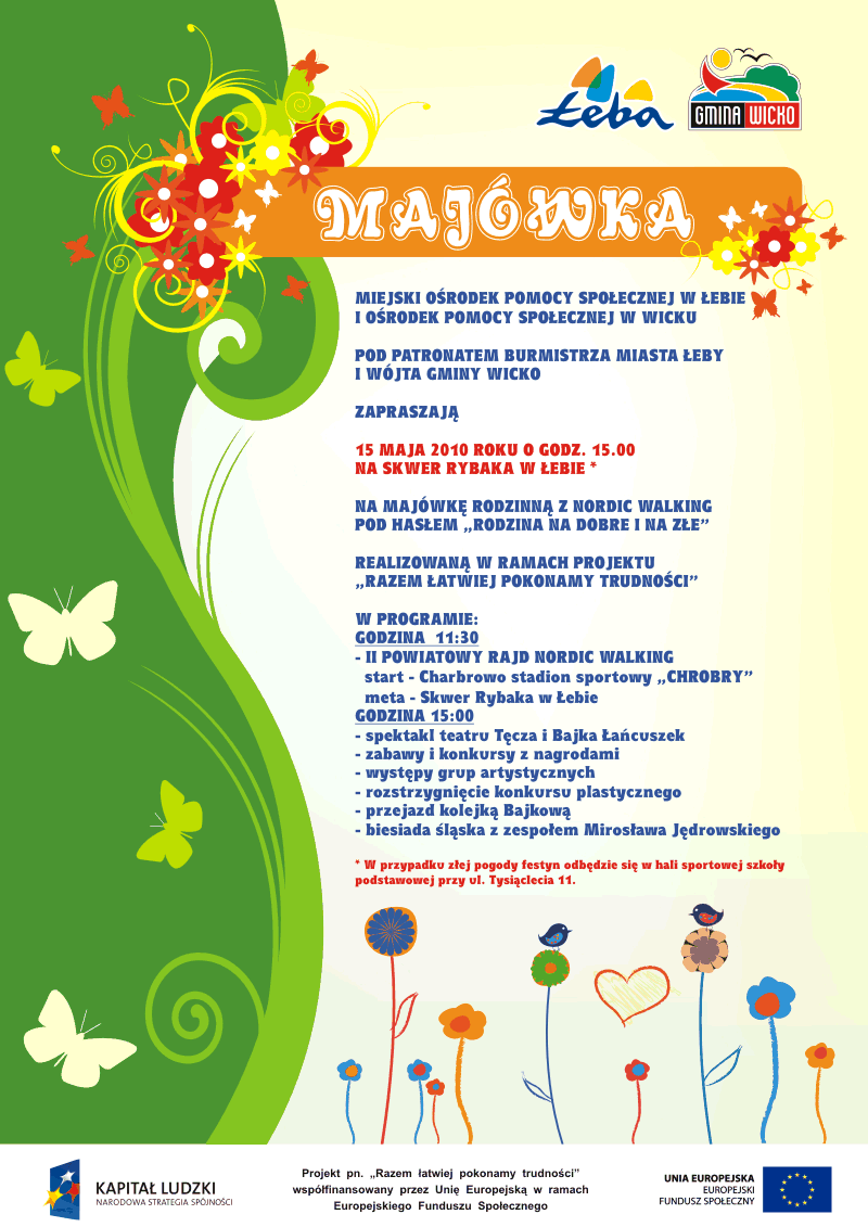 Miejski Ośrodek Pomocy Społecznej w Łebie i Ośrodek Pomocy Społecznej w Wicku pod patronatem Burmistrza Miasta Łeby i Wójta Gminy Wicko zapraszają 15 maja 2010 roku na Skwer Rybaka w Łebie na majówkę rodzinną z nordic walking pod hasłem "Rodzina na dobre i nazłe" realizowaną w ramach projektu "Razem łatwiej pokonamy trudności"