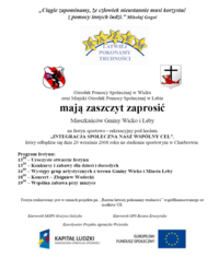 Ośrodek Pomocy Społecznej w Wicku oraz Miejski Ośrodek Pomocy Społecznej w Łebie mają zaszczyt zaprosić Mieszkańców Gminy Wicko i Łeby na festyn sportowo - rekreacyjny pod hasłem „INTEGRACJA SPOŁECZNA NASZ WSPÓLNY CEL”, który odbędzie się dnia 20 września 2008 roku na stadionie sportowym w Charbrowie.