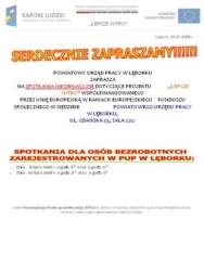 POWIATOWY URZĄD PRACY W LĘBORKU PONOWNIE ZAPRASZA NA SPOTKANIA INFORMACYJNE DOTYCZĄCE PROJEKTU „LEPSZE JUTRO” WSPÓŁFINANSOWANEGO PRZEZ UNIĘ EUROPEJSKĄ W RAMACH EUROPEJSKIEGO FUNDUSZU SPOŁECZNEGO W SIEDZIBIE POWIATOWEGO URZĘDU PRACY W LĘBORKU