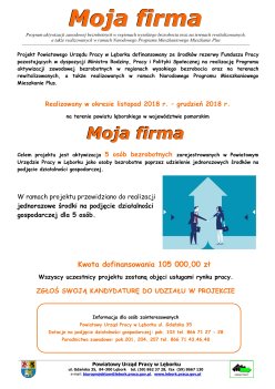 Powiatowy Urząd Pracy w Lęborku informuje, iż pozyskał dodatkowe środki Funduszu Pracy pozostające w dyspozycji Ministra Rodziny, Pracy i Polityki Społecznej na realizację Programu aktywizacji zawodowej bezrobotnych w regionach wysokiego bezrobocia oraz na terenach rewitalizowanych, a także realizowanych w ramach Narodowego Programu Mieszkaniowego Mieszkanie Plus – projekt pn. „Moja firma”.
