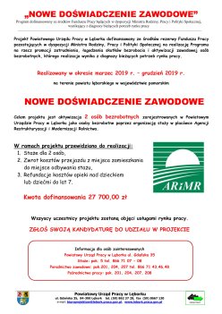 Powiatowy Urząd Pracy w Lęborku informuje, iż realizuje projekt Programu Specjalnego pn. „Nowe horyzonty" finansowany ze środków Funduszu Pracy przyznanych algorytmem skierowany do osób bezrobotnych najbardziej oddalonych od rynku pracy, dla których Powiatowy Urząd Pracy w Lęborku ustalił III profil pomocy.