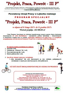 Powiatowy Urząd Pracy w Lęborku informuje, iż realizuje projekt Programu Specjalnego pn. „Projekt, Praca, Powrót – III P” finansowany ze środków Funduszu Pracy przyznanych algorytmem skierowany do osób bezrobotnych najbardziej oddalonych od rynku pracy, ze szczególnym uwzględnieniem osób, dla których Powiatowy Urząd Pracy w Lęborku ustalił III profil pomocy.