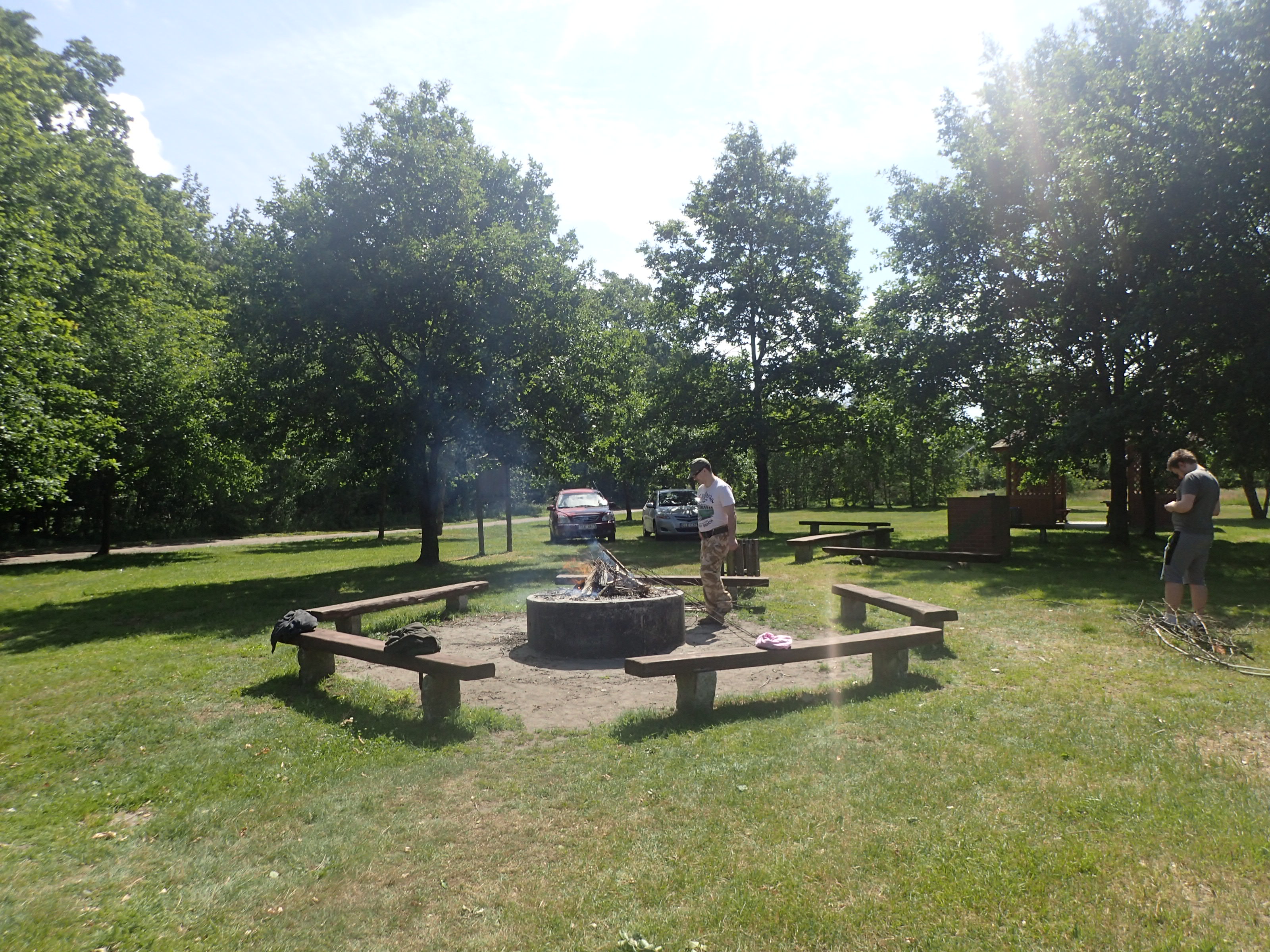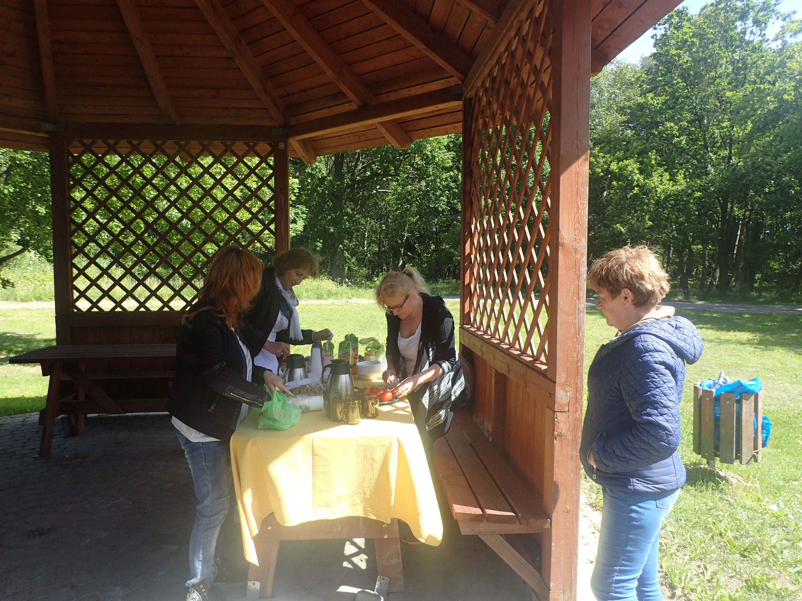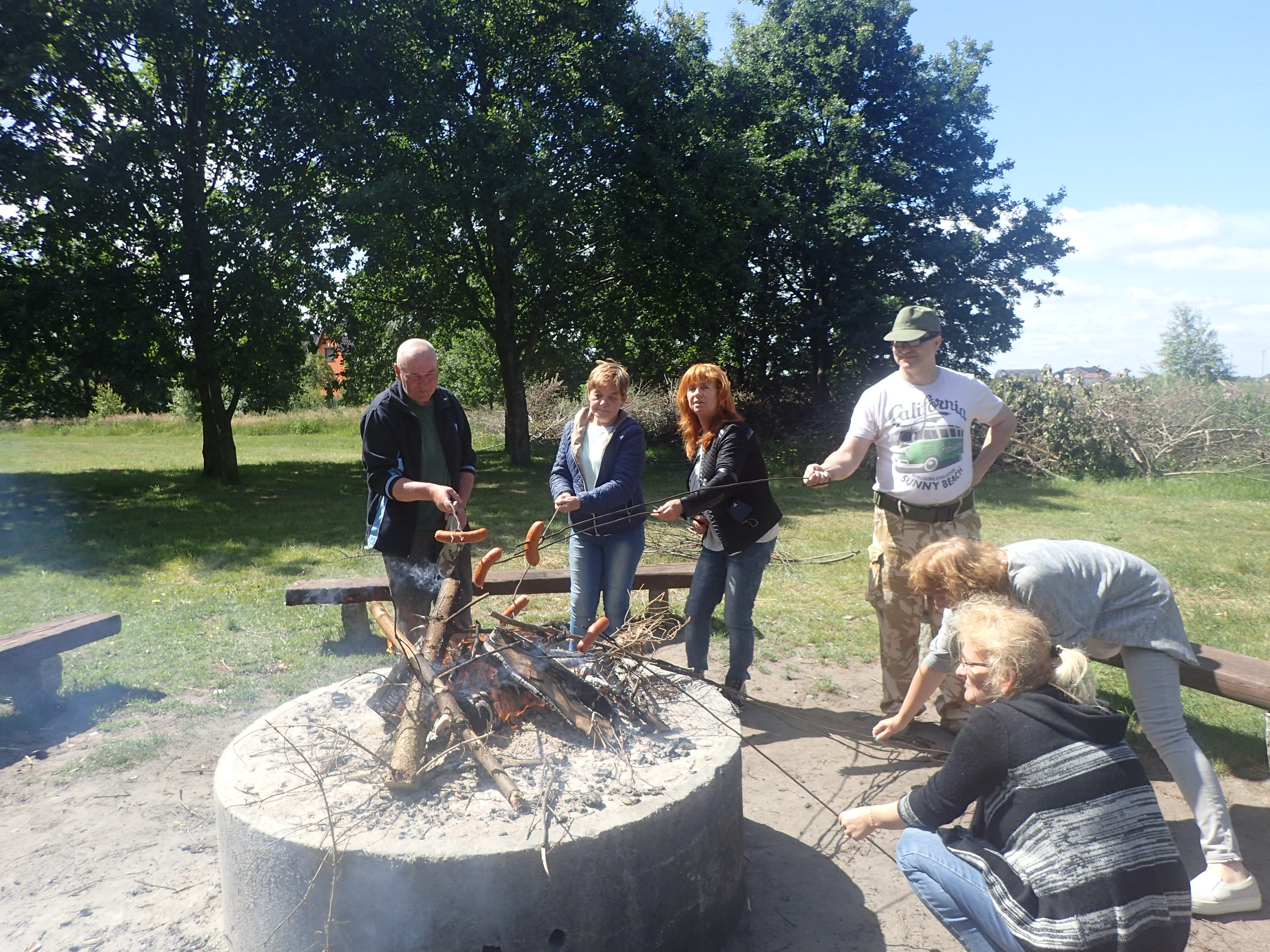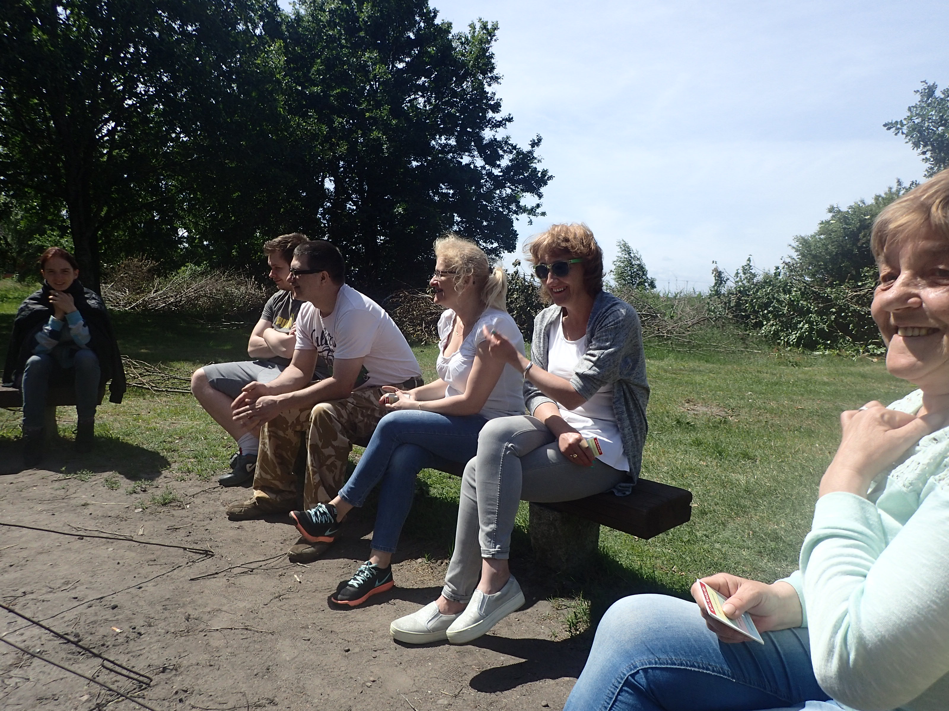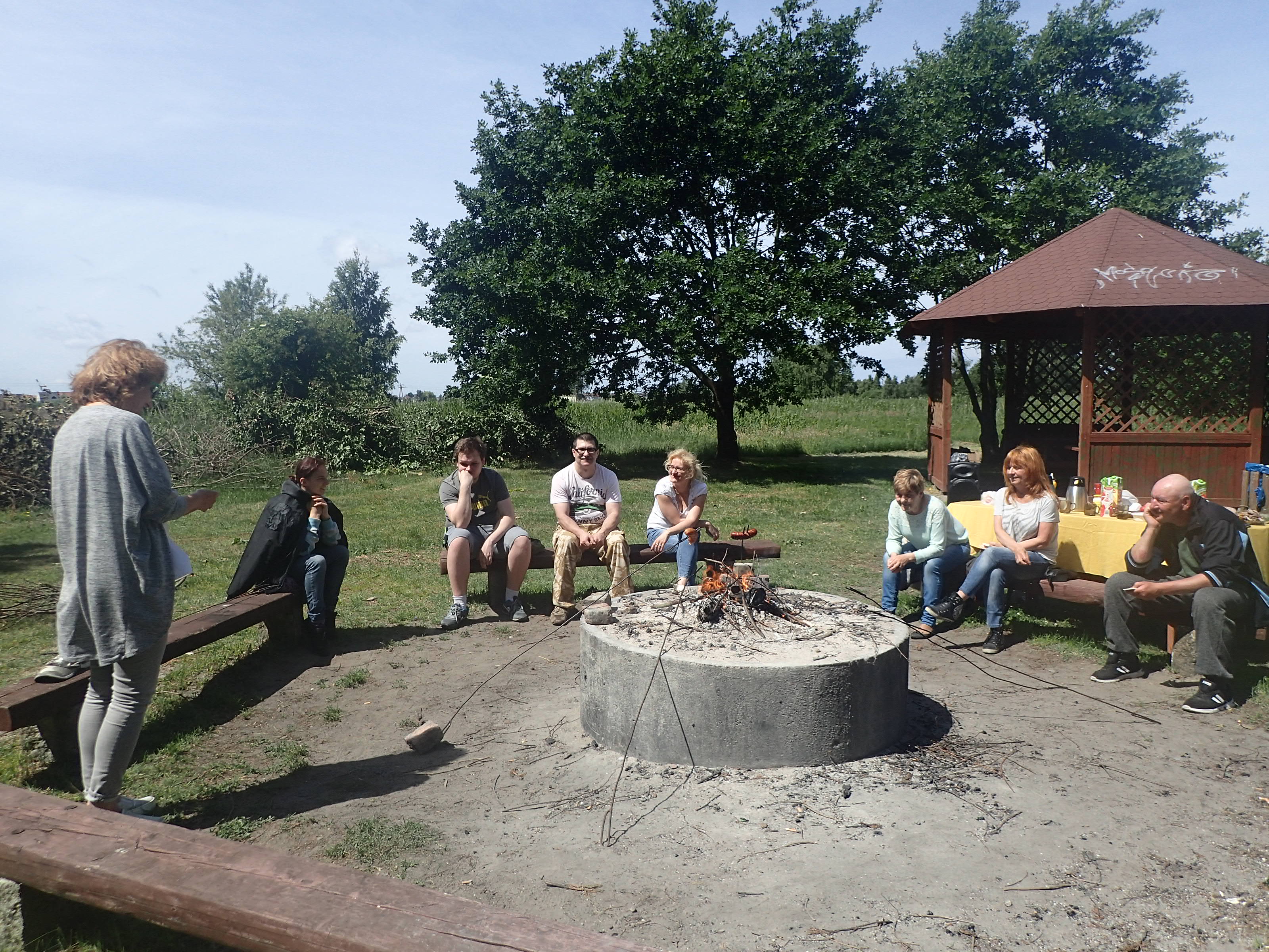 Po rozpaleniu ogniska przez mężczyzn, kobiety przygotowały posiłek, kiełbaski, i sałatkę oraz nakryły do stołu. Przy ognisku podczas pieczenia kiełbasek toczyły się rozmowy na tematy bieżące dotyczące kwestii formalnych uczestniczenia w projekcie a po nich nastąpiły luźne rozmowy i żarty. Kiedy wszyscy się posilili, opiekun merytoryczny L. Rz. zaproponował zabawy w kalambury oraz zabawę w 5 sekund, w której trzeba było wykazać się nie lada refleksem tzn. w ciągu pięciu sekund odpowiedzieć na zadane pytanie. W trakcie zabawy KALAMBURY, grupa została podzielona na dwa zespoły, które rywalizowały ze sobą o to, kto odgadnie najwięcej haseł. Zabawa rozluźniła wszystkich uczestników i wszyscy bez wyjątku chętnie w niej brali udział.